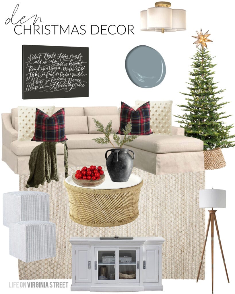 DEN MOOD BOARD SOURCES: Linen Sectional | Rug | Coffee Table | Scallop Light Fixture | Striped Ottoman Poufs | Ceramic Vase | Faux Cedar Branch | Wood Bowl | Ornaments | Tripod Floor Lamp | TV Stand | Christmas Tree | Woven Tree Collar | Black Stewart Plaid Pillow Cover | Pom Pom Pillow Cover (look for less here) | Cozy Pom Pom Throw | Fringe Pillow | Moravian Star Tree Topper | ‘Silent Night’ Canvas | Board and Batten Paint Color: Benjamin Moore Van Courtland Blue