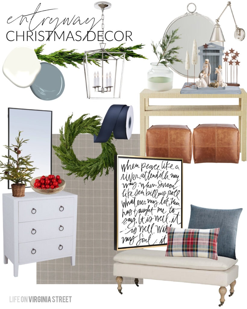 ENTRYWAY MOOD BOARD SOURCES: Garland (also available here) | Grosgrain Ribbon | Plaid Rug | Lantern Pendant Chandelier | White Raffia Cabinet | Black Thin Framed Mirror | Wood Bowl | Ornaments | Wreath | Mini Lit Tree | Raffia Console Table | Leather Poufs | Round Mirror | Paint Dipped Vase | Faux Berry Juniper Branch | Wood Nativity | Wood Crèche | Metal Stars | Cypress Trees | Swing Arm Sconce | ‘It Is Well’ Canvas | Bench (finally back in stock!) | Linen Pillow | Plaid Lumbar & Sherpa Pillow | Door Color: Benjamin Moore Water’s Edge | Wall Color: Simply White