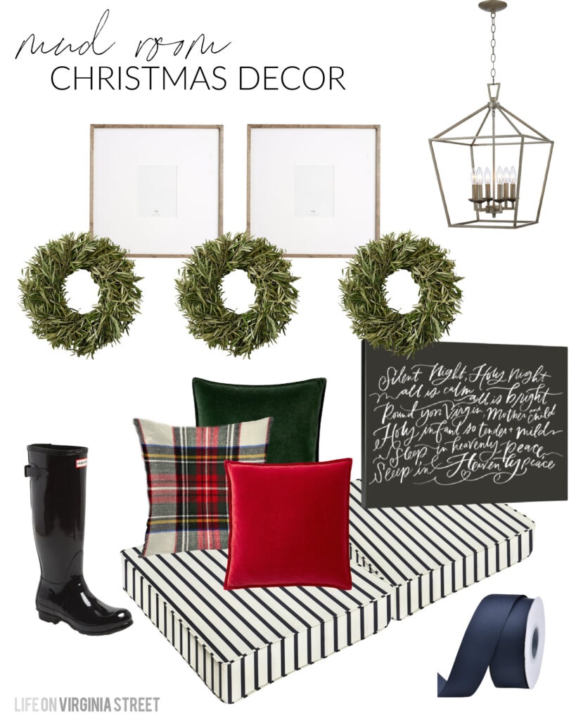 MUD ROOM CHRISTMAS DESIGN BOARD SOURCES: Gallery Frames | Striped Cushions | Lantern Pendant Light | Plaid Pillow Set | Velvet Pillows | Hunter Boots | Wreaths | ‘Silent Night’ Canvas | Grosgrain Ribbon