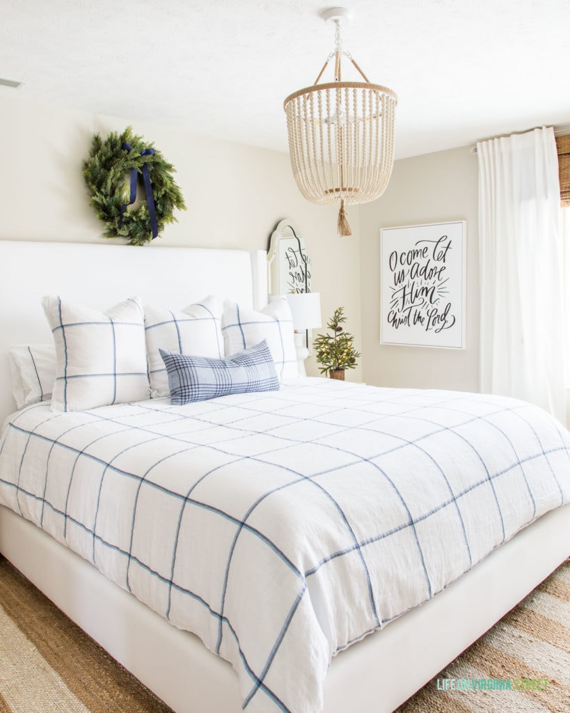 CHRISTMAS GUEST BEDROOM SOURCES: Upholstered Bed | Bead Chandelier | Striped Rug | Windowpane Plaid Bedding | Plaid Lumbar Pillow | Raffia Nightstands | Mirrors | Lamps | Noise Machine | Wreath | Lit Mini Tree | ‘O Come Let Us Adore Him’ Canvas