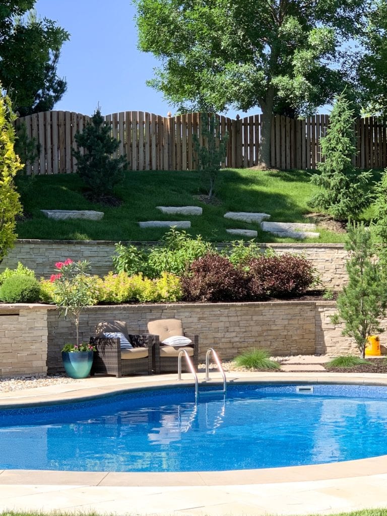 This is one of the top requests on Kurtis’ list. You may remember last year, I spent hour and after tearing out sod between the limestone terraces in our back yard. I made good progress, but once the real heat of summer arrived, I couldn’t do much more. This area has always been a bit of a mystery to us, and we haven’t really loved it from day one. But, it was necessary because the grade on the hill right there is unbelievably steep (as in, you’d probably fall down if you tried to walk it). Below is a picture before I started. I’d say I made it from the right side almost all the way to the start of the pine tree on the left. We’ll likely just hire the rest out and based on how some of the grass came back, we’re hoping they can add black weed paper or something equivalent to stop grass from growing.