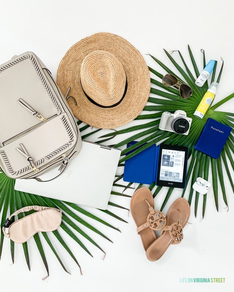 SOURCES: Laptop Backpack | Silk Sleep Mask | Packable Straw Hat | Aviator Sunglasses | SPF Part Powder | Mousse Sunscreen | Mirrorless Travel Camera | Passport Cover (old from J. Crew Factory) | Kindle Paperwhite | Kindle Cover | AirPods Pro | Tory Burch Leather Flip Flops (color: Makeup)