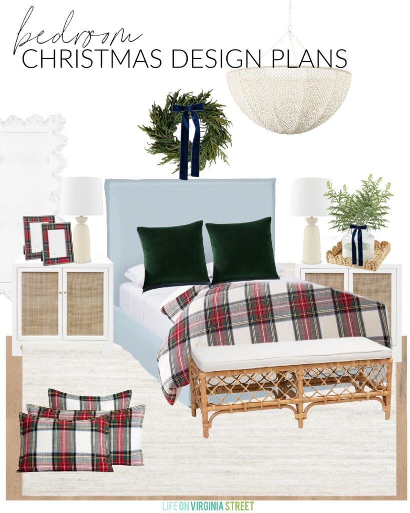 CHRISTMAS BEDROOM SOURCES: Upholstered Bed (look-for-less option here) | Nightstands | Chandelier | Rug | Real-Touch Wreath | Navy Blue Velvet Ribbon | Stewart Plaid Duvet Cover & Euro Shams | Velvet Throw Pillow Covers | Lamps | Vase | Faux Norfolk Pine Stems | Stewart Plaid Picture Frames | Coral Style Mirror | Bench