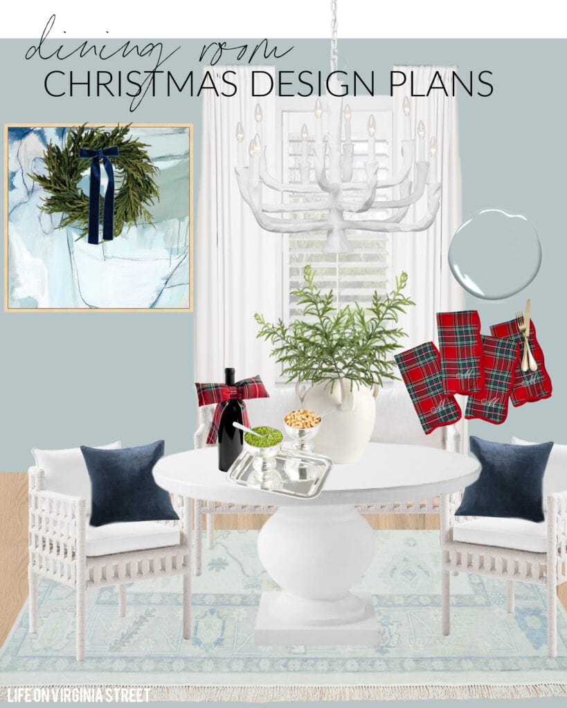CHRISTMAS DINING ROOM SOURCES: Dining Chairs | Dining Table | Rug | Chandelier | Abstract Art | Real-Touch Wreath | Navy Blue Velvet Ribbon | Vase | Faux Real-Touch Greenery | Scalloped Tartan Plaid Napkins | Wine Bottle Bow Collar | Silver Serving Set | Paint Color: Benjamin Moore Smoke