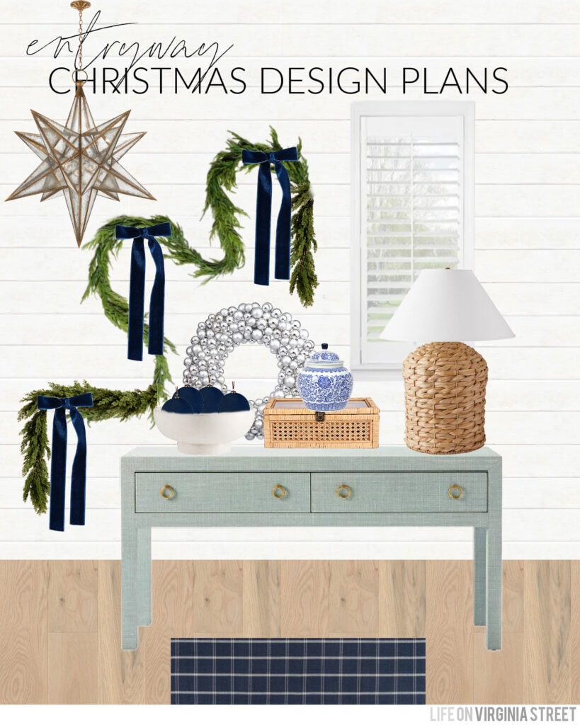 CHRISTMAS ENTRYWAY SOURCES: Moravian Star Chandelier | Real-Touch Garland | Cedar Garland | Console Table | Lamp | Navy Blue Velvet Ribbon | Navy Blue Flocked Ornaments | Footed Bowl | Ornament Wreath | Rattan Box | Small Ginger Jar Vase | Plaid Rug