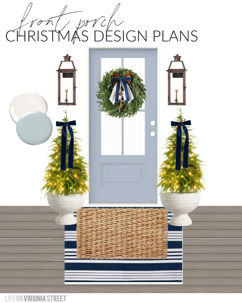 CHRISTMAS FRONT PORCH SOURCES: Wreath | Gas Lanterns | Pre-Lit Faux Christmas Trees | Navy Blue Velvet Ribbon | Footed Planters | Striped Outdoor Rug | Woven Doormat | Paint Colors: Sherwin Williams Greek Villa and Sherwin Williams Niebla Azul