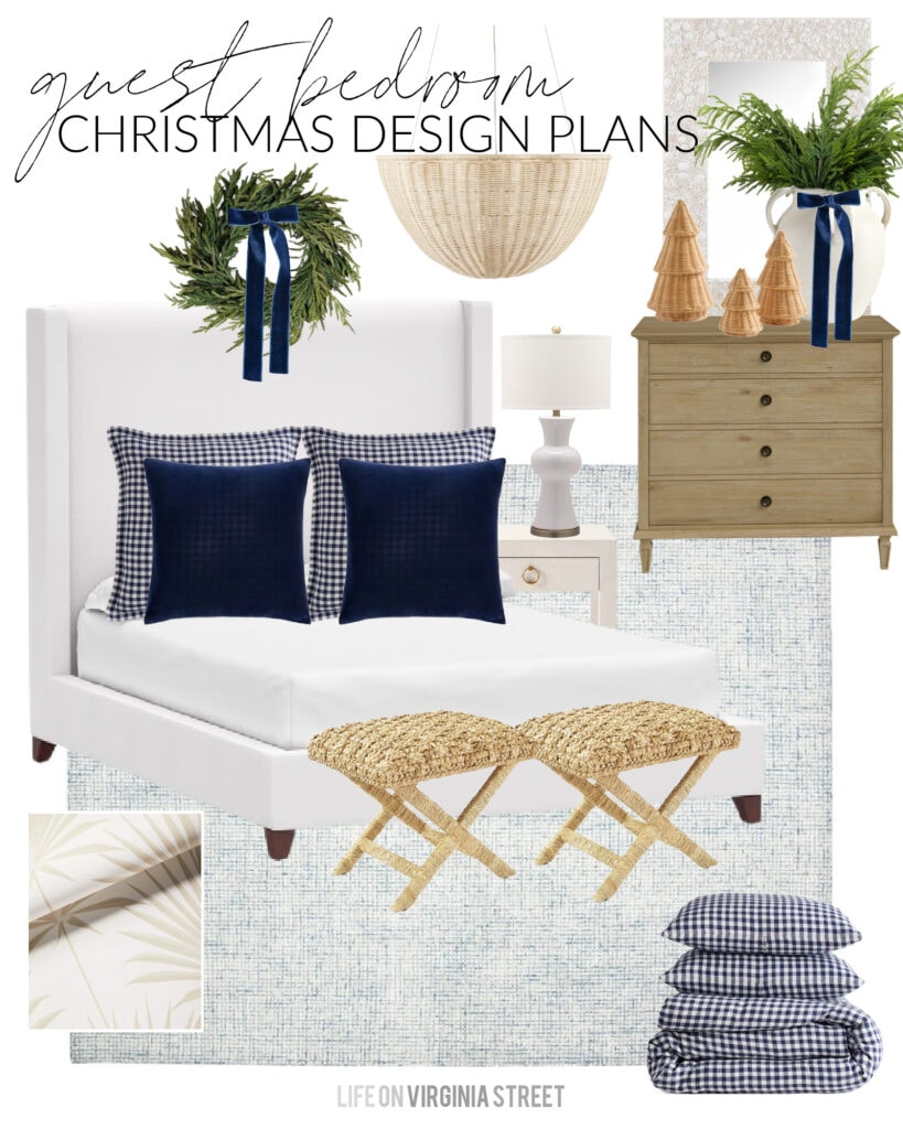 CHRISTMAS GUEST BEDROOM SOURCES: Bed | Wreath | Velvet Ribbon | Nightstand | Lamp | Rug | Wicker Chandelier | Linen Gingham Duvet Cover Set | Velvet Pillow Covers | Dresser | Faux Evergreen Stems | Vase | Palm Wallpaper | Woven Stools | Wicker Christmas Trees (look for less here)