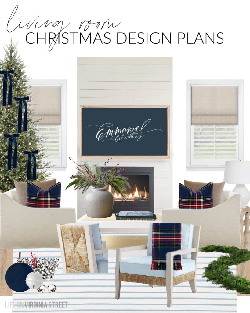 CHRISTMAS LIVING ROOM SOURCES: Woven Shades (Bonaire Flaxen) | Sofas (read my full review here) | Chairs | Coffee Table | Indoor/Outdoor Striped Rug | Frame TV | “Emmanuel” Frame TV Art | Linen Pillow Covers | Plaid Pillow Covers | Plaid Throw Blanket | Vase | Faux Juniper & Berry Bundle | “Ralph Lauren” Coffee Table Book | “Ralph Lauren: A Way of Living” Coffee Table Book “ | Lamps | Rope Sofa Table | Faux Garland | Christmas Tree | Navy Blue Velvet Ribbon | Christmas Tree Collar | Jingle Bell Vase Filler | Navy Blue Velvet Ornaments (smaller size here) | Silver Jingle Bell Ornaments