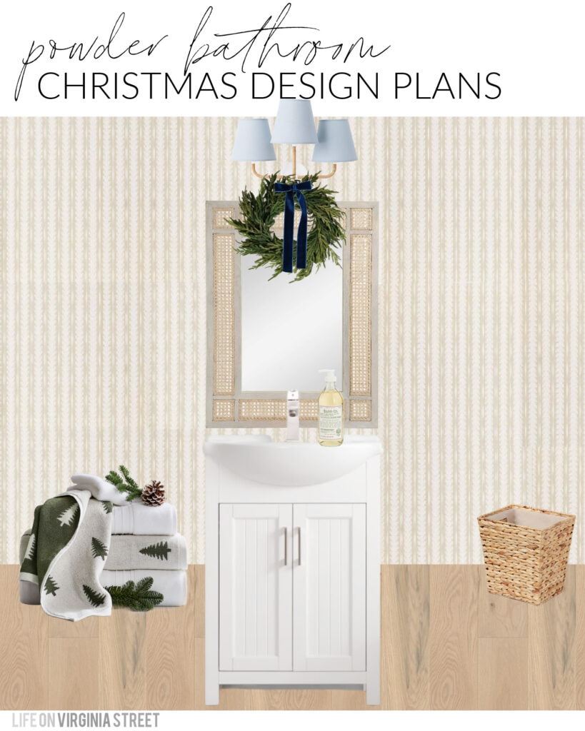 CHRISTMAS POWDER BATH SOURCES: Oceana Wallpaper | Rattan Vanity Light | Cane Mirror (similar here) | Real-Touch Wreath | Navy Blue Velvet Ribbon | Vanity | Faucet | Hand Soap | Seagrass Waste Basket | Reversible Pine Tree Towels