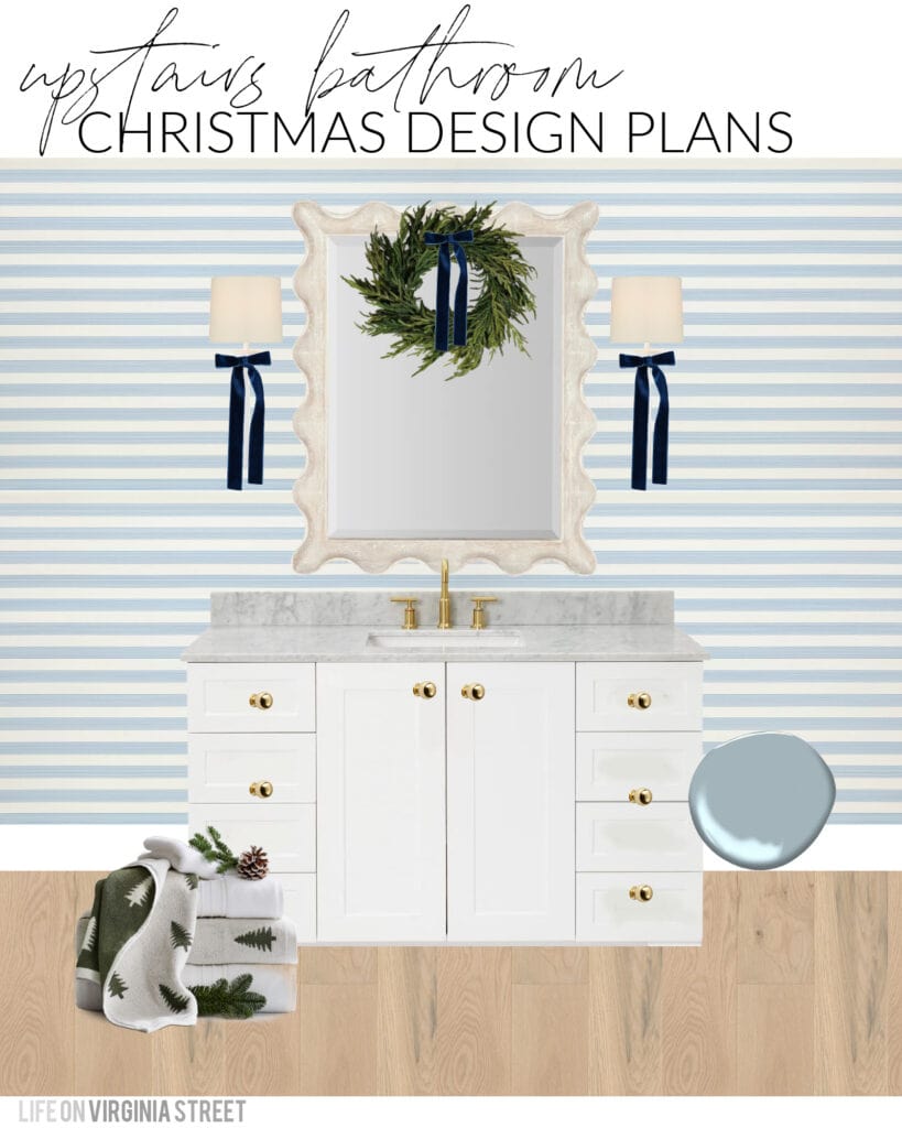 CHRISTMAS BATHROOM SOURCES: Scalloped Mirror | Sconces | Real-Touch Wreath | Navy Blue Velvet Ribbon | Cabinet Knobs | Reversible Pine Tree Towels | Striped Wallpaper | Scalloped Bath Mat | Paint Sample: Benjamin Moore Santorini Blue