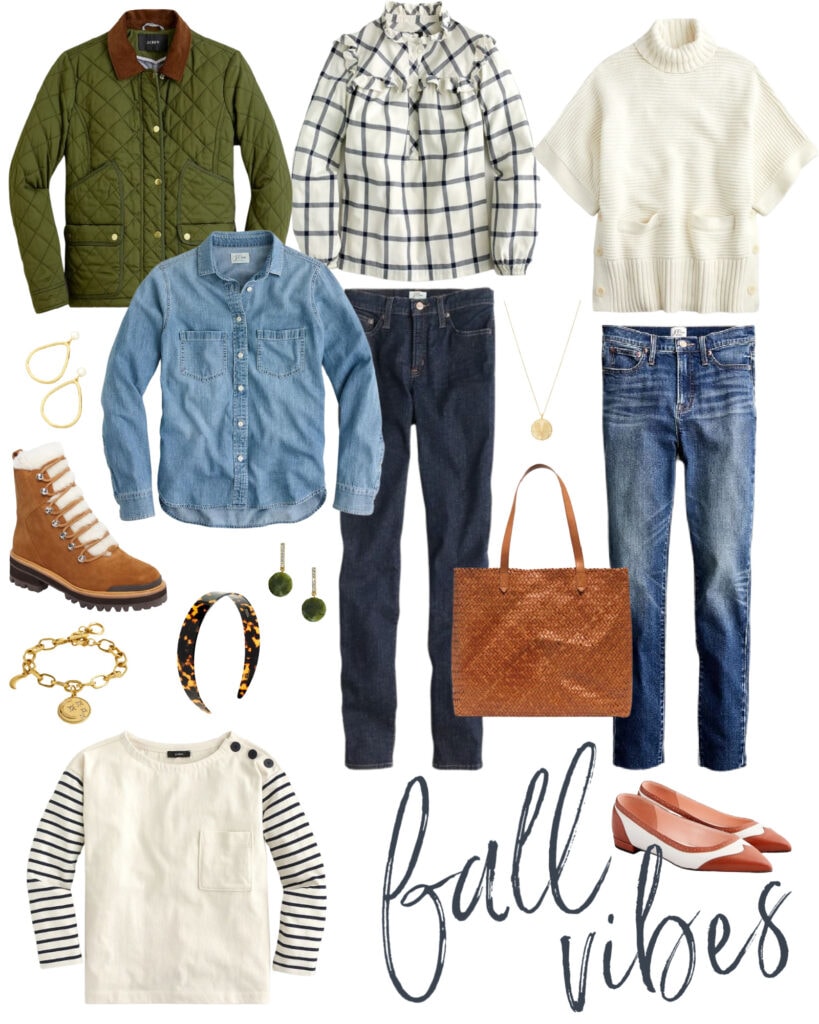 SOURCES: Quilted Jacket | Ruffled Plaid Flannel Top | Sweater Poncho | Chambray Top | Pearl Drop Earrings | Dark Skinny Jeans | Mid-Wash Skinny Jeans | Coin Pendant Necklace | Shearling Boots | Gold Coin Charm Bracelet | Tortoise Headband | Green Stone Earrings | Woven Leather Tote | Pointed Toe Leather Flats | Striped Sleeve Button Shoulder Top