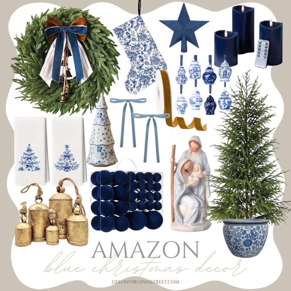 SOURCES: Wreath | Chinoisserie Christmas Hand Towels | Bell Set | Blue & White Stocking | Blue & White Ceramic Christmas Tree | Pre-Tied Velvet Bows | Velvet Ornaments | Star Tree Topper | Flameless Candle Set | Mini Ginger Jar Ornaments | Velvet Ribbon | Nativity Figurine | 4′ Norfolk Pine Tree | Blue & White Planter