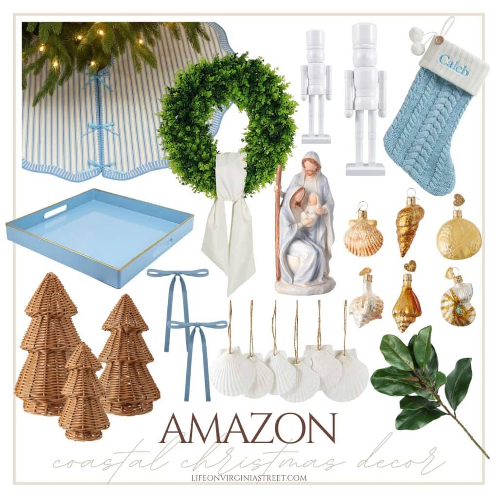 SOURCES: Striped Scalloped Tree Skirt | Boxwood Wreath with Sash | White Nutcrackers | Personalized Stocking | Decorative Tray | Woven Tree Set | Velvet Bows | Scallop Shell Ornaments | Nativity Set | Glass Seashell Ornaments | Faux Magnolia Stems