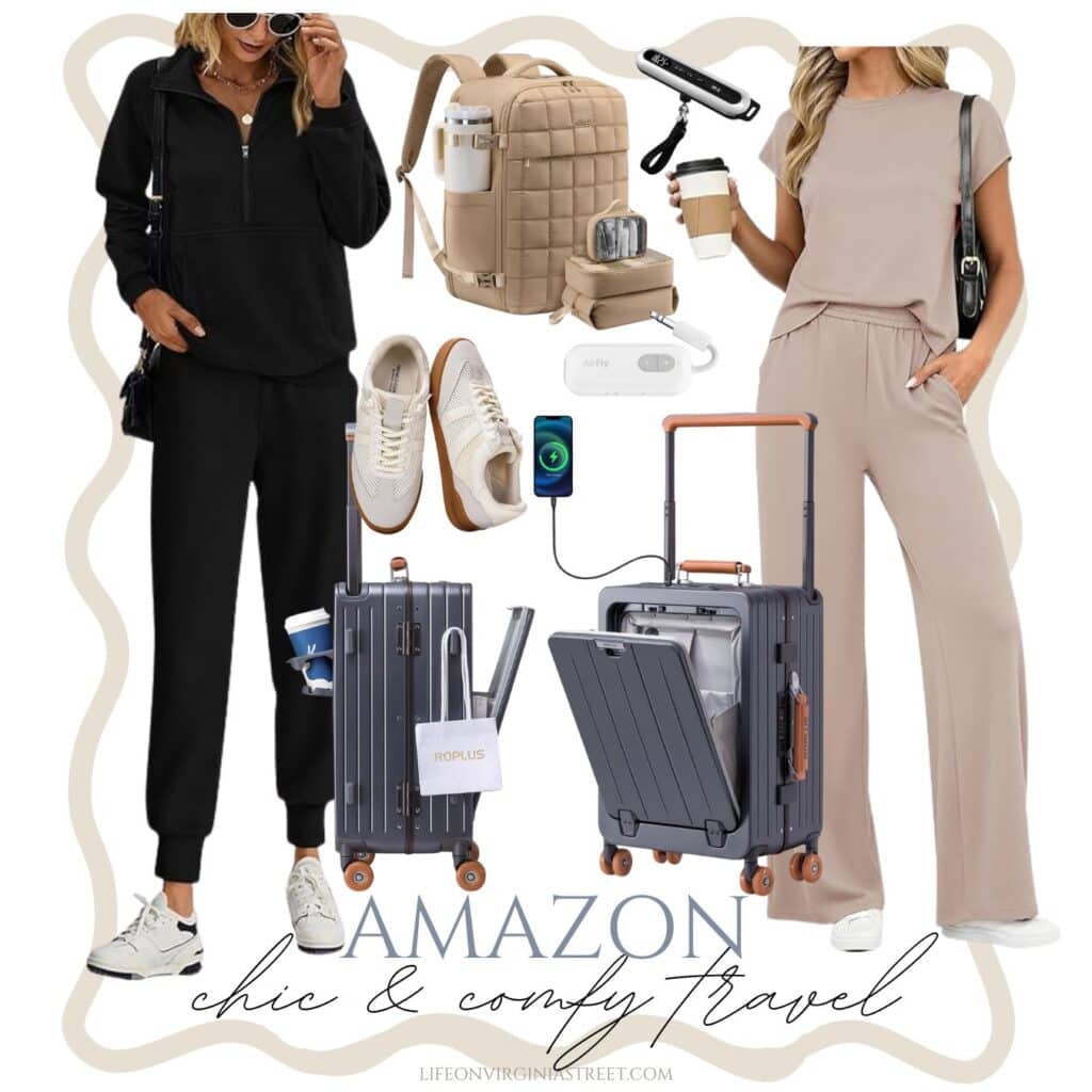 SOURCES: Long Sleeve Two-Piece Set | Travel Backpack (similar here) | Sneakers | Luggage Scale | Airfly Wireless Audio Transmitter | Charging Luggage Set | Short Sleeve Two-Piece Set