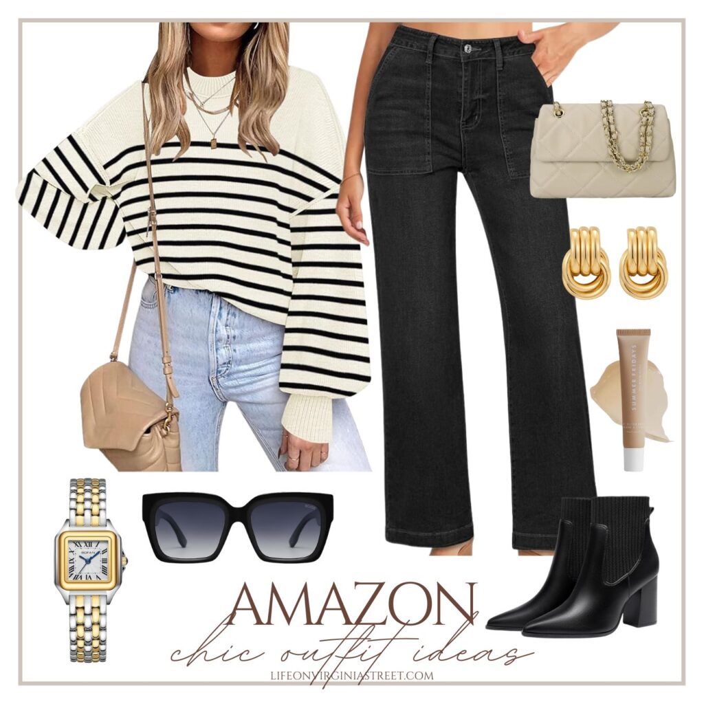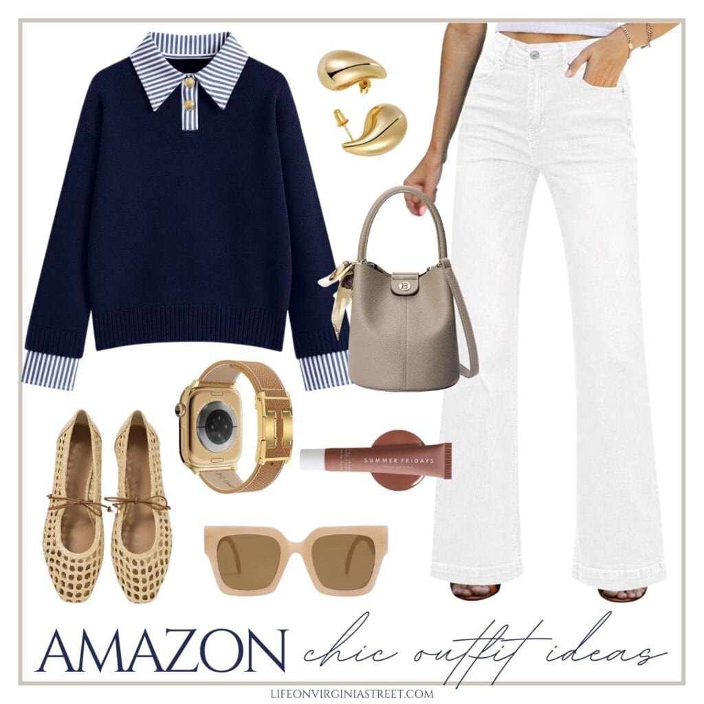 SOURCES: Sweater with Striped Collar and Cuffs | Woven Ballet Flats | Stretchy High-Waisted Jeans | Crossbody Bucket Bag | Teardrop Earrings | Apple Watch Band | Sunglasses | Lip Balm