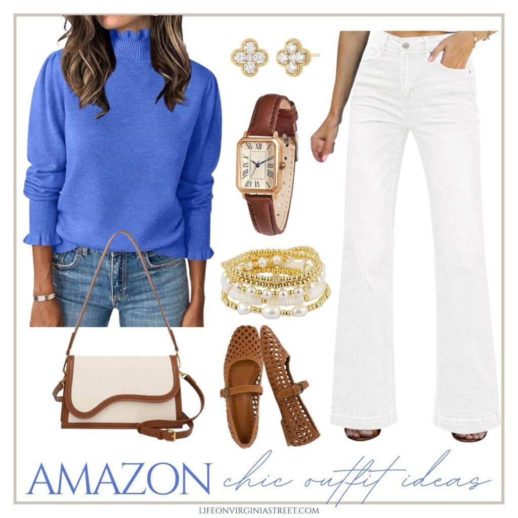 SOURCES: Ruffle Neck & Sleeve Sweater | Crossbody Purse | Stretchy High-Waisted Jeans | Clover Earrings | Woven Ballet Flats | Bracelet Stack | Leather Watch