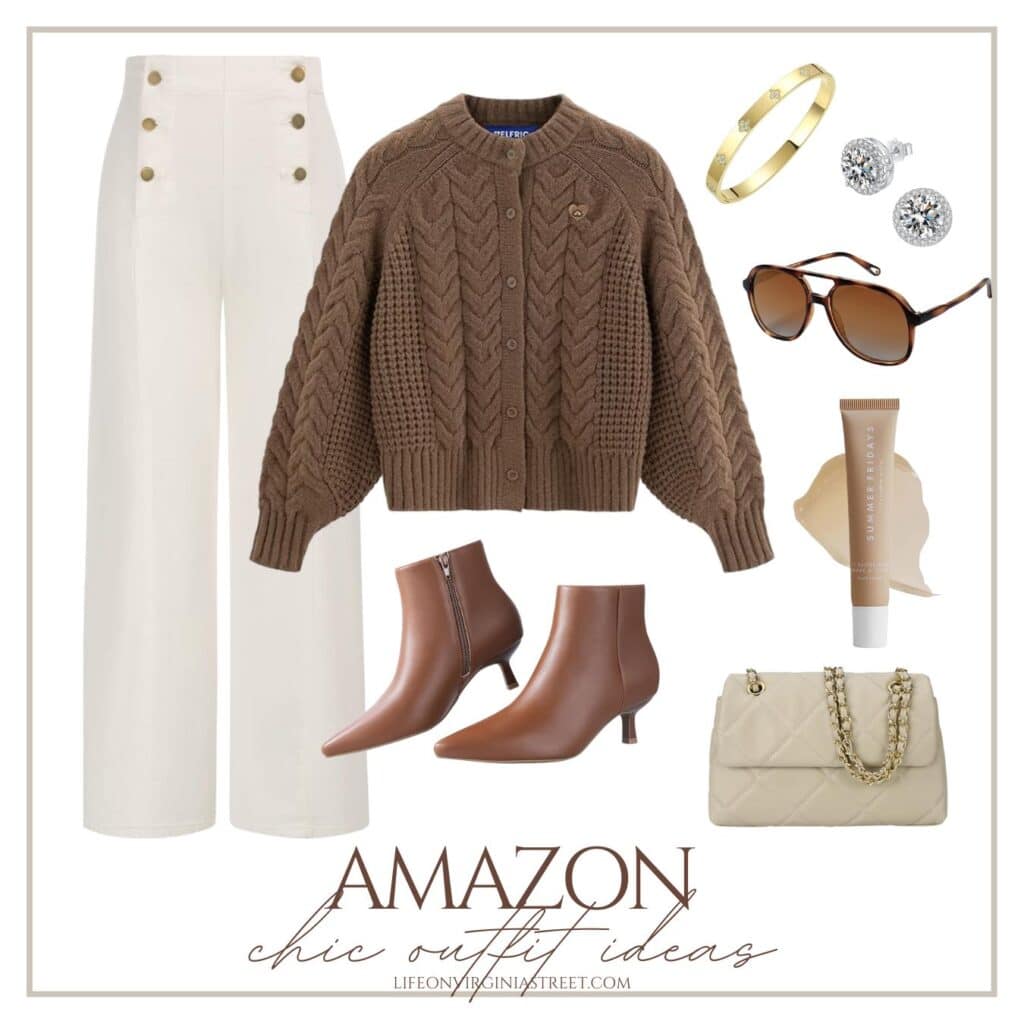 SOURCES: Wide-Leg Jeans | Cardigan Sweater | Booties | Bracelet | Stud Earrings | Sunglasses | Lip Balm | Quilted Purse