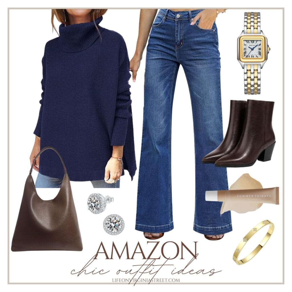 SOURCES: Turtleneck Sweater | Slouchy Purse | Earrings | Flare Jeans | Watch | Boots | Lip Gloss | Bracelet