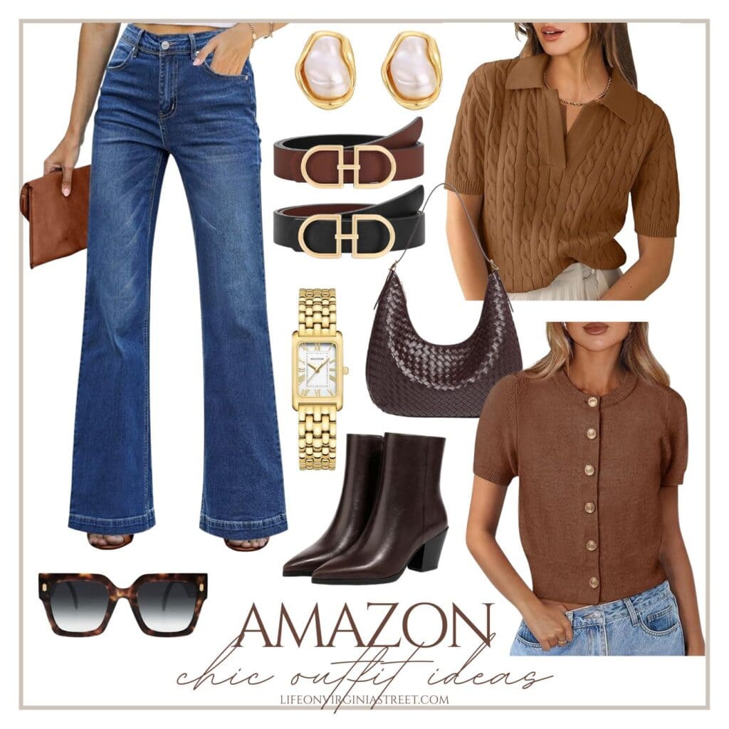 SOURCES: High-Waisted Flare Jeans | Sunglasses | Pearl Earrings | Reversible Belt | Watch | Woven Purse | Ankle Boots | Short Sleeve Cableknit Sweater | Short Sleeve Cardigan Sweater
