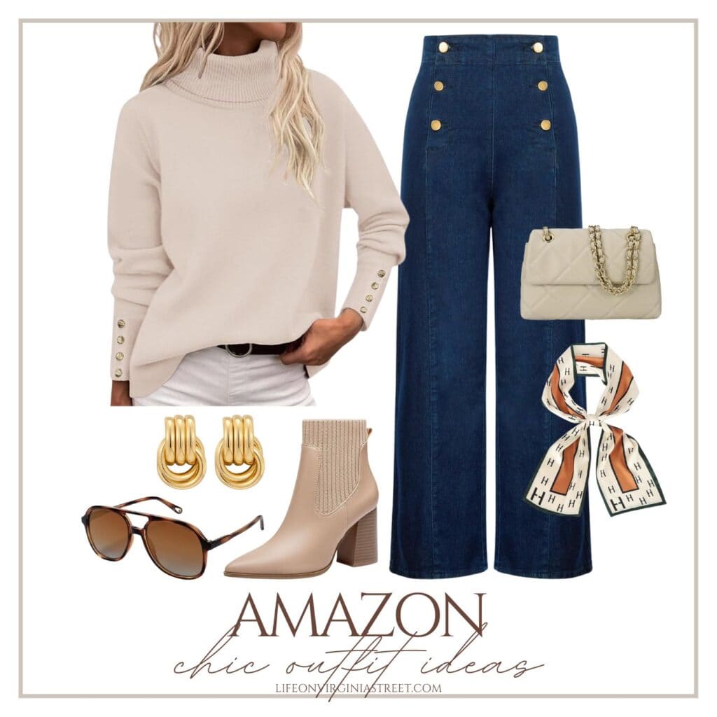 SOURCES: Turtleneck Sweater | Knot Earrings | Sunglasses | Pointed Toe Booties | Wide Leg Jeans | Quilted Purse | Silk Scarf