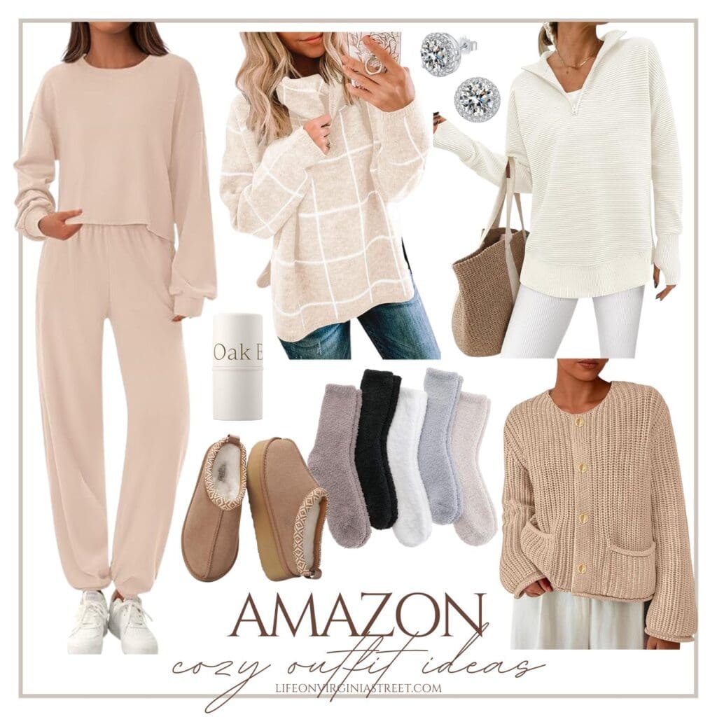 SOURCES: Two-Piece Lounge Set | Windowpane Turtleneck | Oak Essentials Conditioning Lip Balm | Platform Slippers | Cozy Socks | Stud Earrings | Ribbed Quarter-Zip Pullover | Chunky Knit Cardigan
