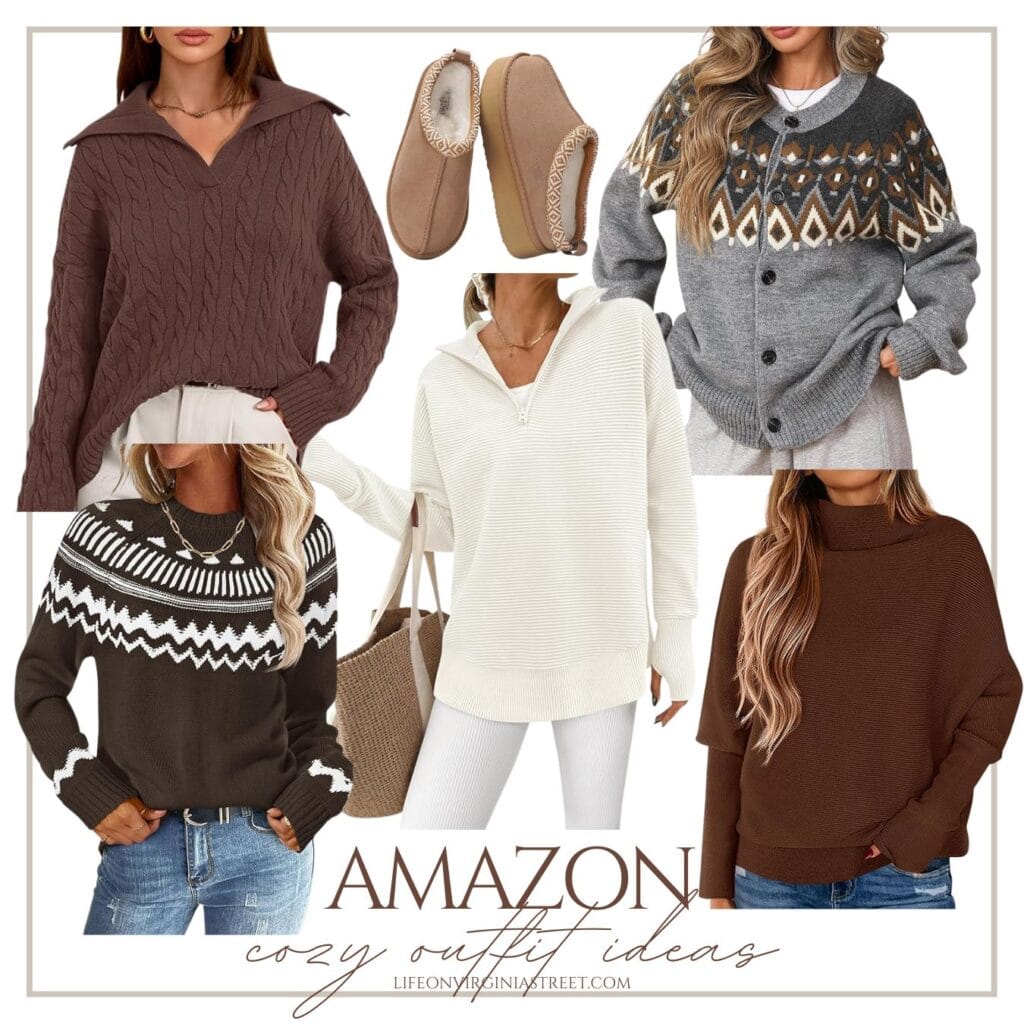 SOURCES: Cableknit V-Neck Polo Sweater | Fair Isle Crewneck Sweater | Platform Slippers | Ribbed Quarter-Zip Pullover | Fair Isle Cardigan Sweater | Loose Turtleneck Sweater