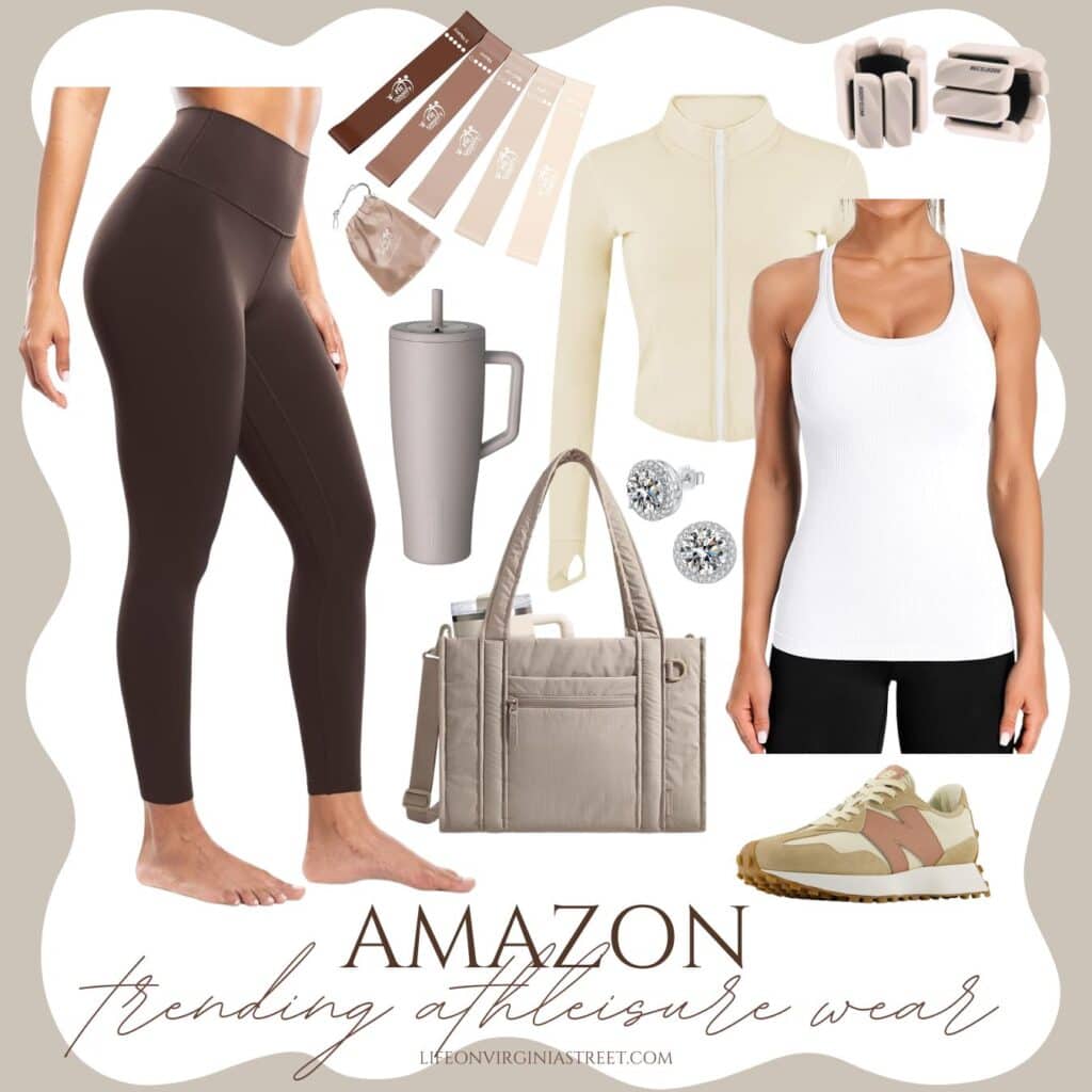 SOURCES: Leggings | Resistance Bands | Tumbler | Tote Bag | Stud Earrings | Lightweight Jacket | Wrist & Ankle Weights | Ribbed Workout Tank | New Balance Sneakers