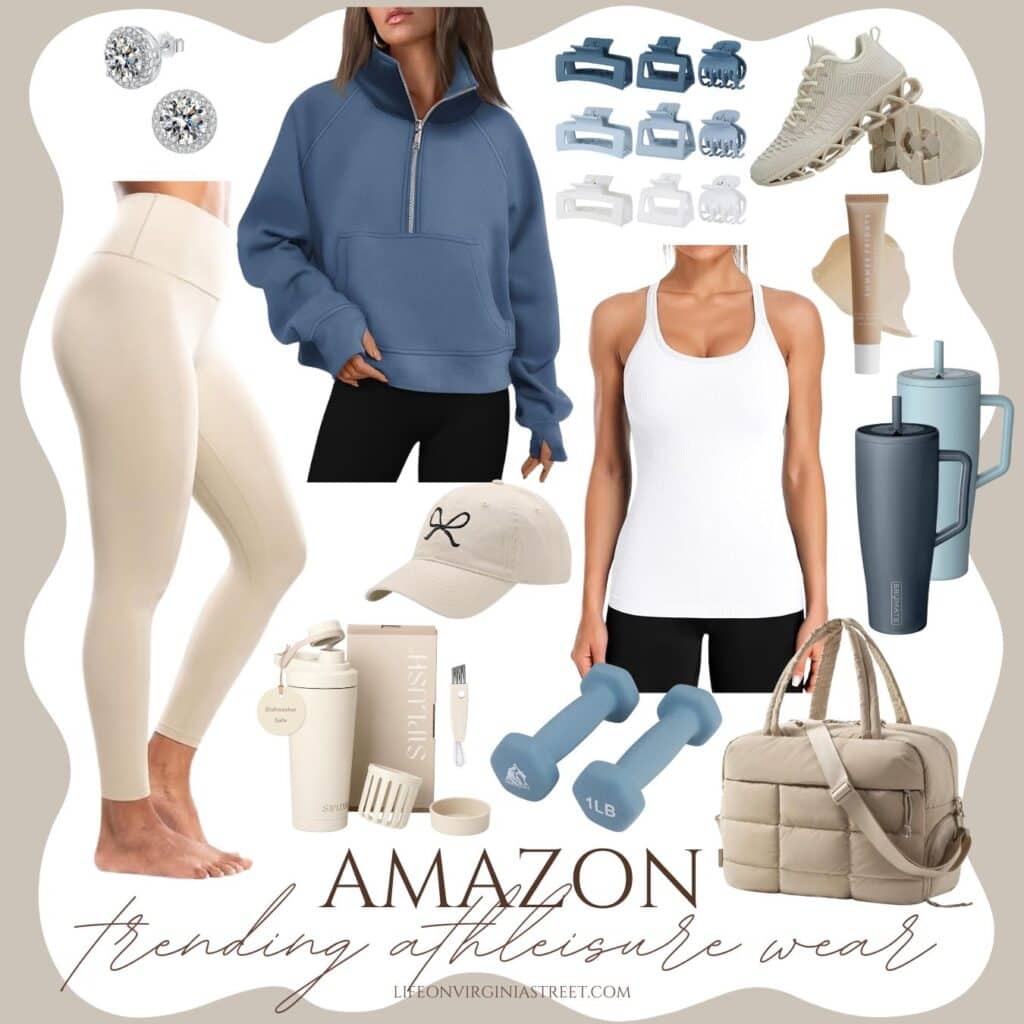 SOURCES: Stud Earrings | Leggings | Half-Zip Sweatshirt | Bow Hat | Shaker Bottle Set | Hair Clips | Ribbed Workout Tank | Neoprene Coated Dumbbells | Sneakers | Lip Balm | Tumblers with Handle & Straw | Puffer Gym Bag