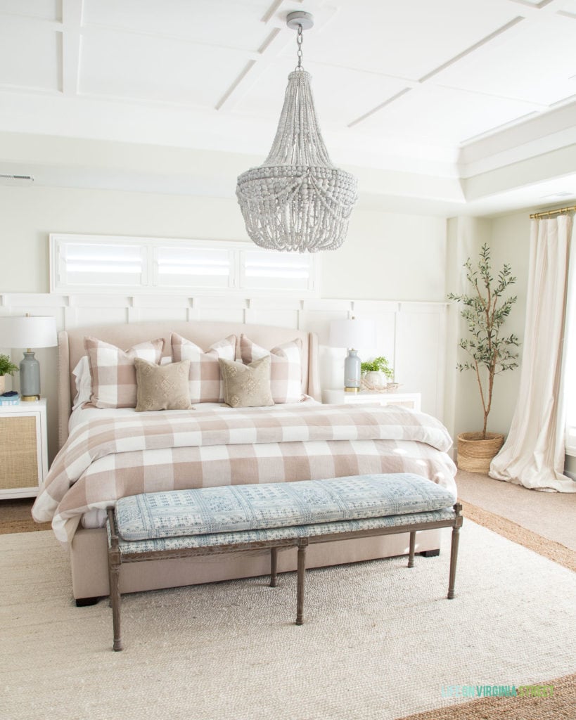 MASTER BEDROOM SOURCES: Similar Bed | Wood Bead Chandelier | Bench | Buffalo Check Bedding & Pillows | Embroidered Pillows | Striped Curtains | Gold Curtain Rod | Faux Olive Tree | Cane Nightstands | USB Ceramic Lamps | Rug | Similar Manzanita Branch | Similar Faux Maidenhair Fern Stems