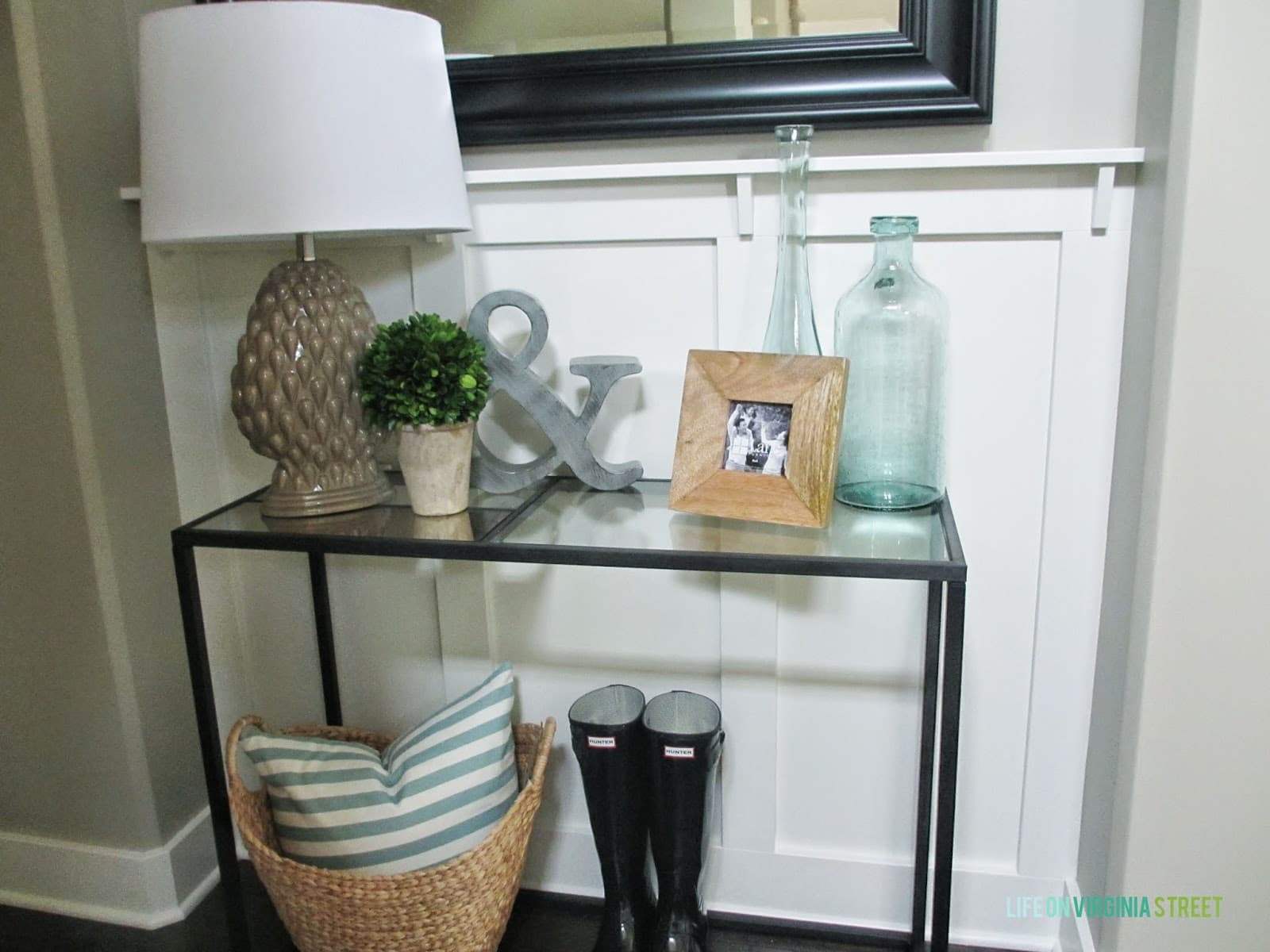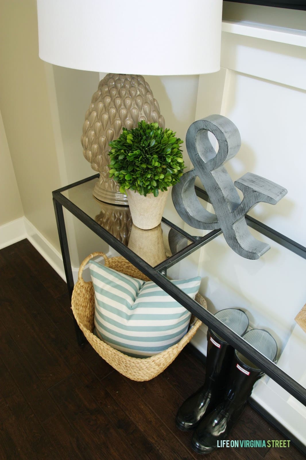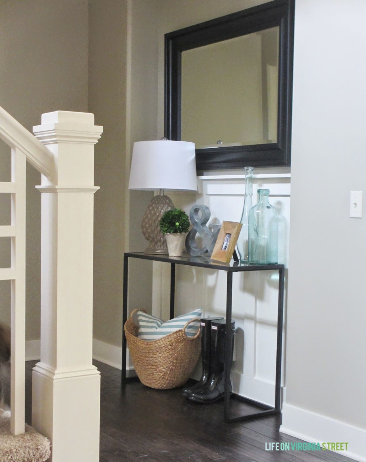 I was recently contacted by Holly & Martin to review a product. I selected the Eamce Console and love it even more than I thought was possible. At first glance, it has rather modern lines and a contemporary overall feel that perhaps initially I wouldn’t be drawn to. However, with the right accessories I knew it would be perfect in our home {and that it could work well regardless of one’s preferred style} and would help give some contrast to other elements in the space. I love the slightly industrial vibe the metal adds to the space. Here’s how the entryway looks now: