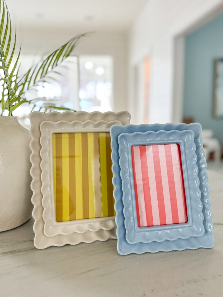 I have two darling teenage sisters who live in our neighborhood that work for me an hour or two a week helping create video content. When they saw these scalloped frames they already decided they needed some for their bedroom. They’re heavy stoneware, come in tons of colors and sizes, and we all agree the striped inserts were so cute that it would be fun to almost use them as a matte for those little Polaroid style prints that are so popular right now. Long story short, these would make a fun gift idea for the younger generations, too!