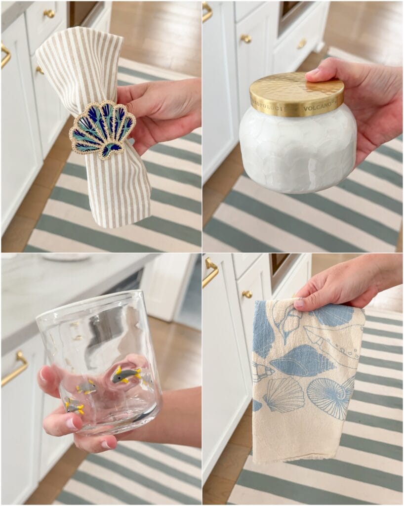 SOURCES: Shell Napkin Ring | Capri Blue Candle | Sardine Glasses | Seashell Cotton Dish Towel