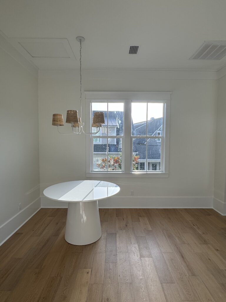 With the layout of the room, you actually come up the stairs into the kitchen and this area opposite of that blank wall, so if you center the table on the window, it can feel a bit crowded. And also make the rest of the space look really empty.