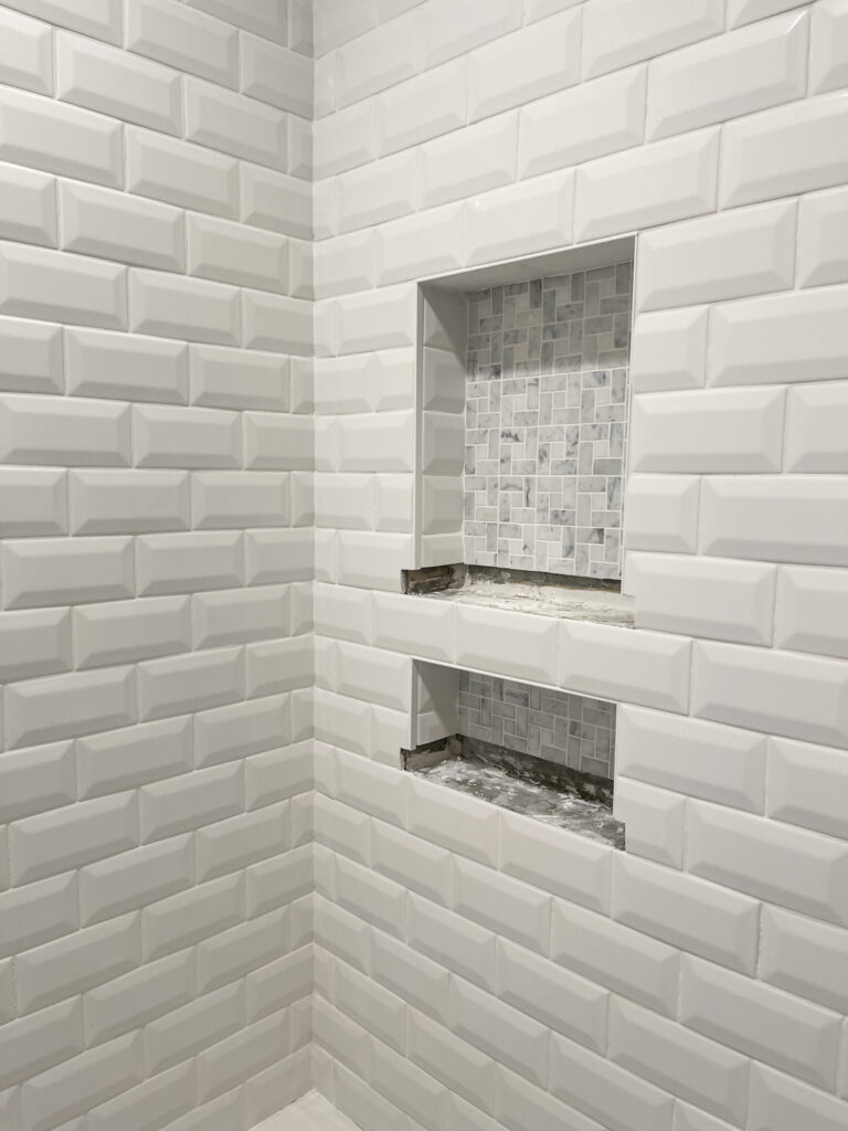 And here’s how the niche looks now! We’re just waiting on the solid surface ledges for each of the niches and then the shower will be 100% done! I don’t want to give too much away on the shower before the big reveal, so here’s a little sneak peek! See what I mean about the bevels really being the star now instead of the dark grout lines?! Love it!