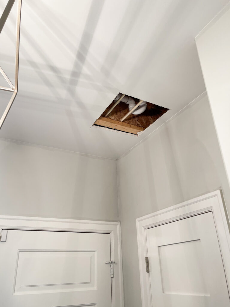 One thing I should mention that was a surprise to us. When you replace a bathtub in your home, they will have to cut a hole in the ceiling underneath it in order to attach the drain. It’s not a huge deal, but definitely something to be aware of! Thankfully ours was in the back corner of our mud room, so it really didn’t cause much disruption at all. And after the drywall guy repaired and mudded it, you can’t even see where the hole was!