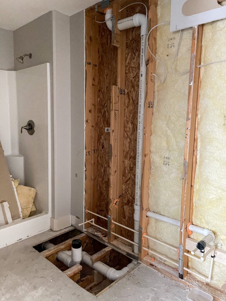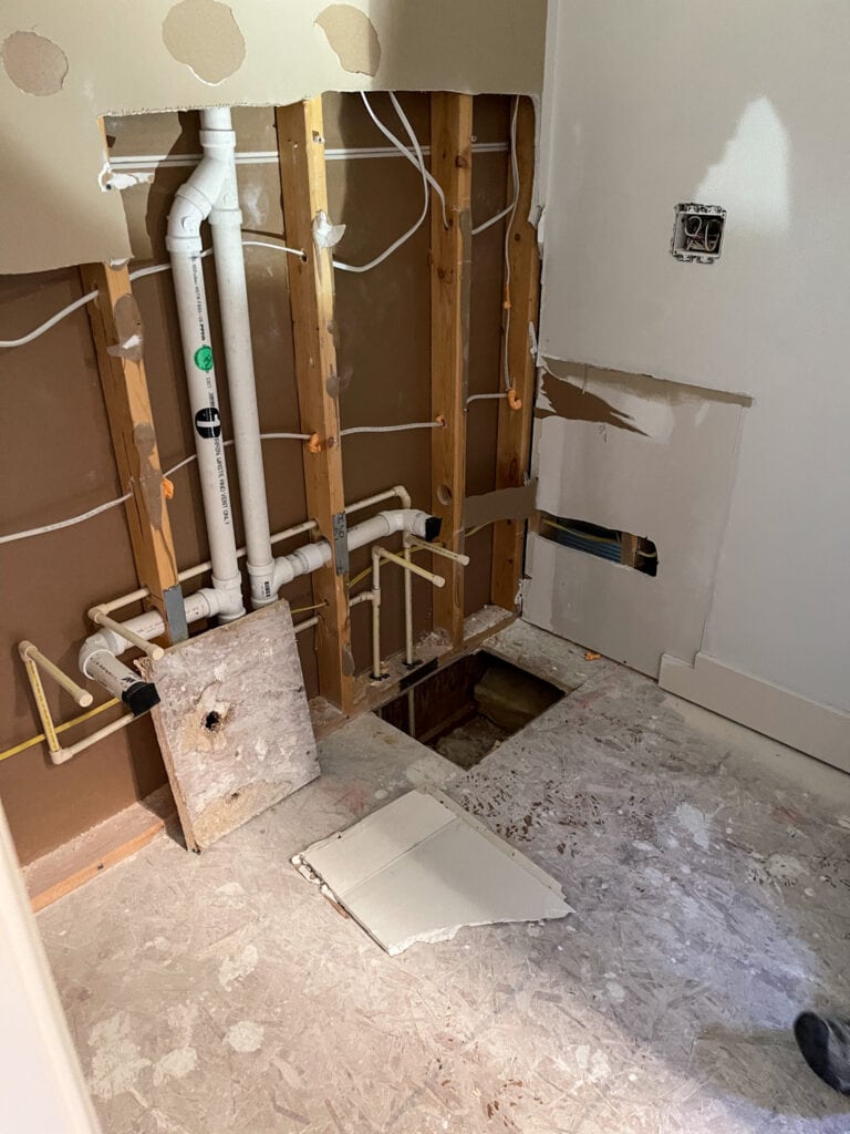 One of the biggest changes in this particular bathroom, was re-routed the off-centered sink line to make room for two sinks. The old plumbing was coming up from the floor rather than the wall. But since our new vanity was furniture style, a second line was added and they both had to come out of the wall. I’m just glad it was professionals doing it, and not us 😉 We also are going from one light fixture centered over the vanity to two fixtures centered over each mirror/sink.