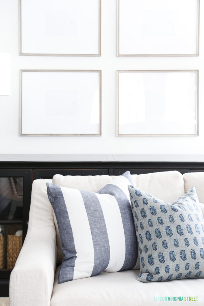 SPRING LIVING ROOM SOURCES: Linen Slope Arm York Sofas | Spindle Chairs | Coffee Table | Wide Stripe Pillows | Similar Paisley Pillows | Ticking Stripe Pillow | Striped Throw Blankets | Topiaries | Blue & White Pots | Wooden Dough Bowl | Faux Fiddle Leaf Fig Tree