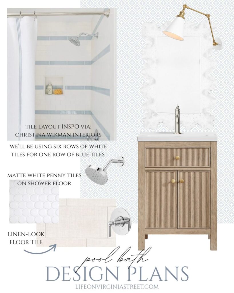 Over the coming weeks, I plan to share a lot more specifics as it relates to the design plans for our new home. If you missed it, last week I shared our plans for Kurtis’ home office and today I’m sharing plans for our blue and white striped pool bath design plans!
