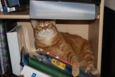 Bearcat (a.k.a. Bubba) is not a small cat. So, his choice of bed today was rather interesting. I heard some commotion while I was on the computer and it turns out he was leveling some items in our bookshelf so he could lay down (those binders were once all upright). Apparently this is more comfortable than any of our four couches, two beds, rugs, etc. throughout our house. Who would have thought?