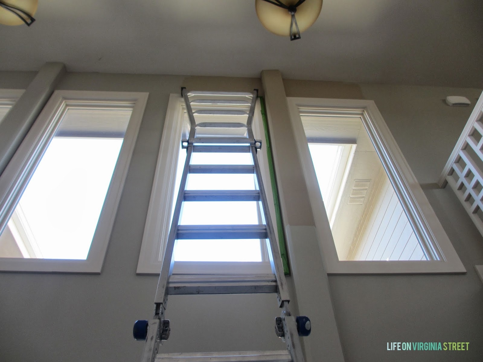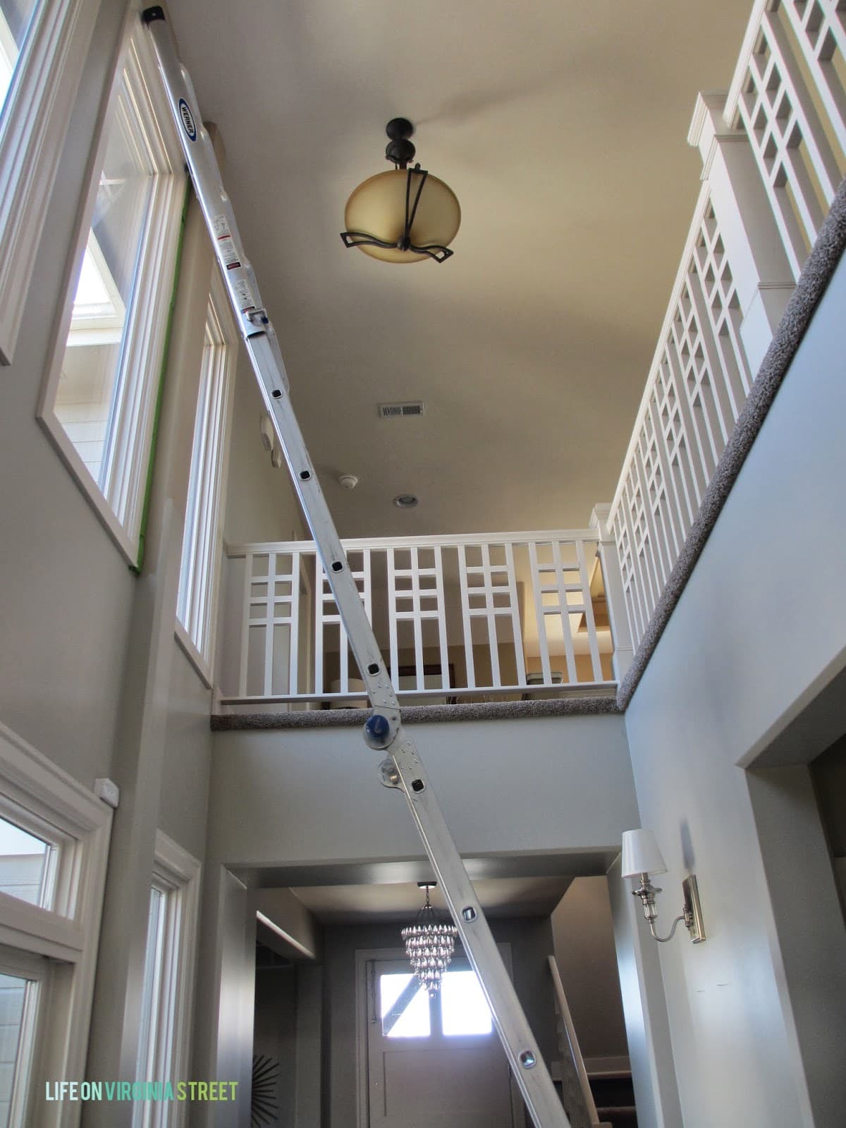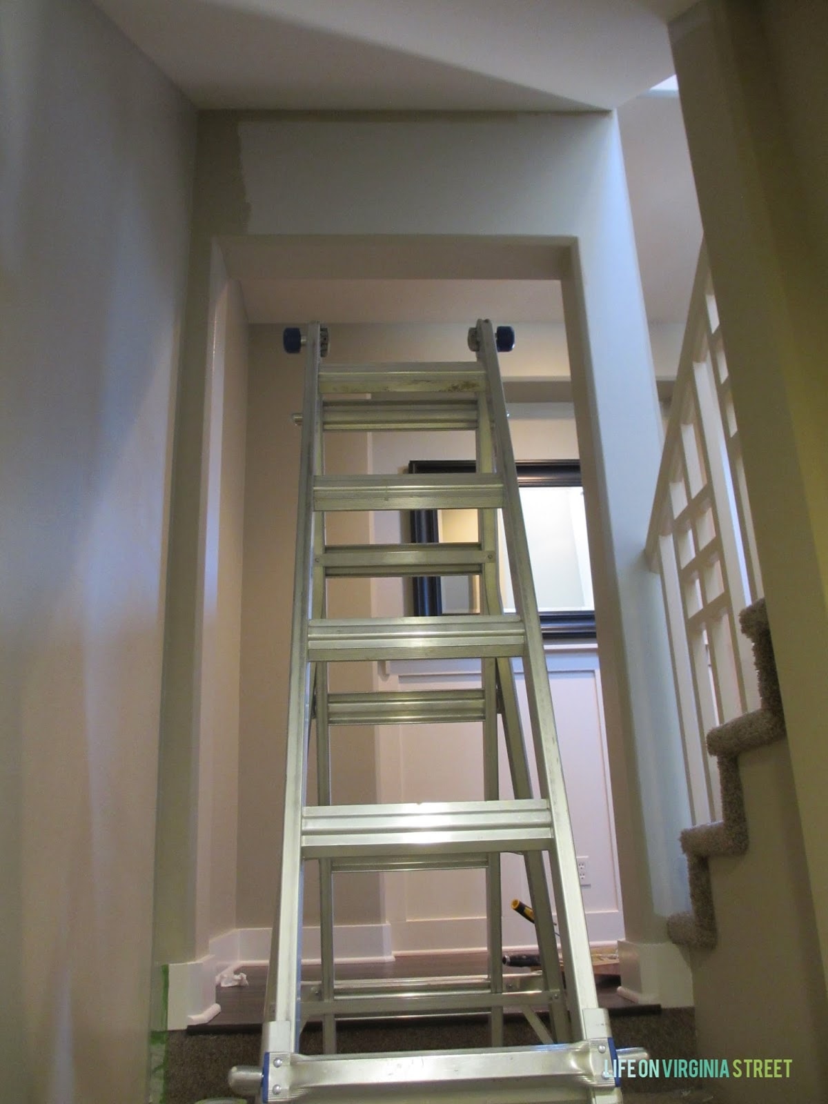 Next up on the projects-that-have-taken-entirely-too-long list was finished a tiny section in our two story hallway. Yeah, I started this back in Decemeber. But, while we had our Little Giant ladder out, we had to get this done. And yes, I am still waiting to find the perfect two lights to replace these two. In the second photo you can see the tiny upper section I had to complete. Still not sure why I left that for three months.