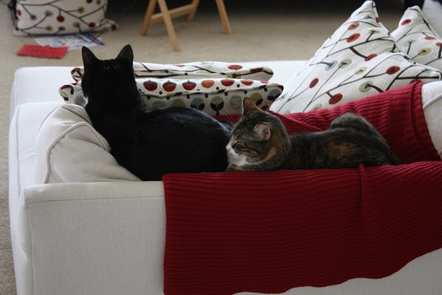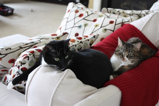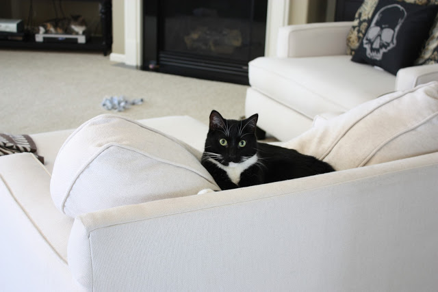 We have had a serious problem for some time now with the backs of our two oversized white chairs. On most days the backs of the chairs were covered in hair and sat on so much {by the cats} that they were completely ruined and did not hold their shape – and the hair would totally get into the weave of the fabric making it impossible to get off. I had looked into new foam and batting and nearly died at the price and was at the point of just buying new furniture.