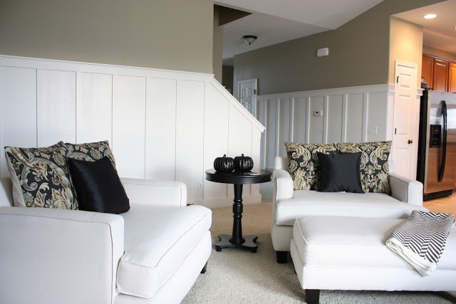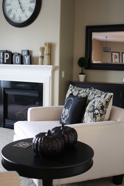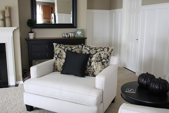 When I told the husband I was going to make some throw pillows for the chairs today, he actually suggested I make new backs to the chairs with the pillows {since ours were beyond ruined}. I loved it! Five hours later here are the results {I made them slightly looser than I have in the past but still went with the 24×24 pillows}. As an FYI – I think it needs a small pillow in front but I simply used our skull Halloween pillows turned backwards for today’s photo shoot 🙂