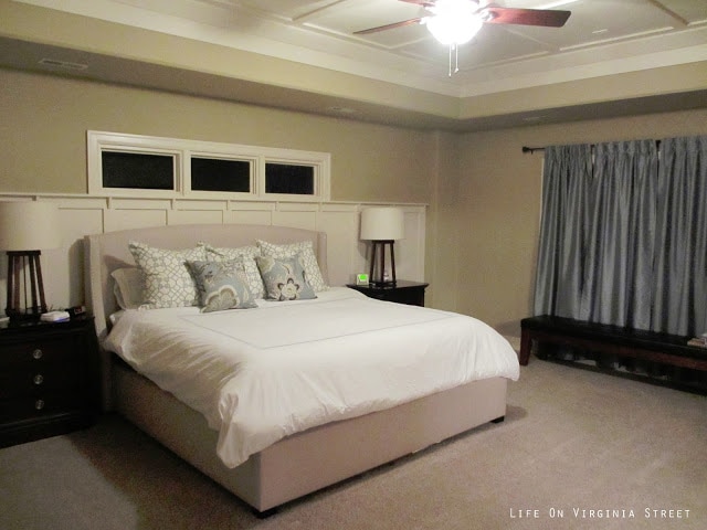 I have always wanted three of these in our entryway area, but I was looking for a silver finish there. I will either spray this one to match when I ever save enough for another two, or I am contemplating leaving it as is and using it in the master to replace the fan {which only has two bulbs and is entirely too dim for the space}.