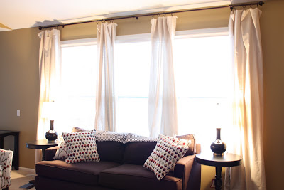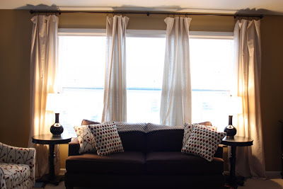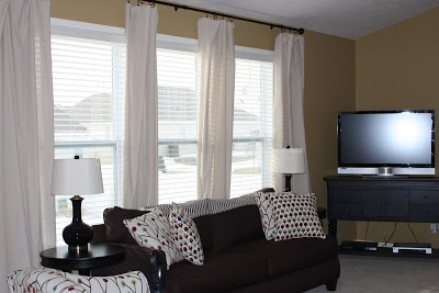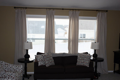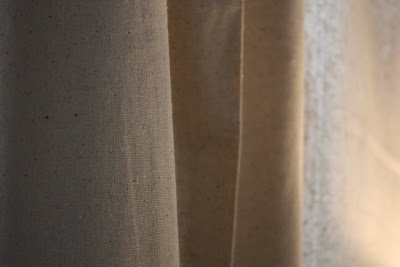 I was at the fabric store the other day, and found some great fabric at $2.49 a yard that looked a lot like linen. I had a 40% off coupon that covered one full cut (so it was only $1.49 a yard). 15 yards later, I had spent about $4.50 per drape panel and have a few yards left over if I ever want to make coordinating pillow or a curtain in the kitchen.