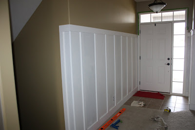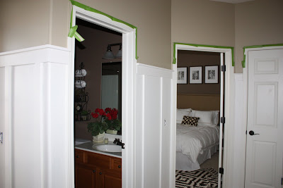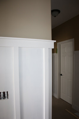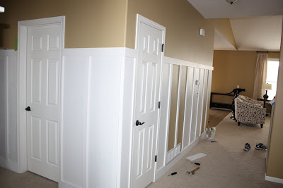 The bulk of our weekend was spent working on our hallway project again {and I did more painting on the staircase}. I changed the top color of paint to the color {Behr Ultra Nile Sand} I have in the bonus room and the staircase {since I had the paint out and it is only a three foot high area} and I am much happier with how it looks. All the white was making the other paint look REALLY yellow and rather bright. Here is a glimpse of the much more subdued paint along with the ledge installed in this area. We still have a few weeks left, but it is moving along!