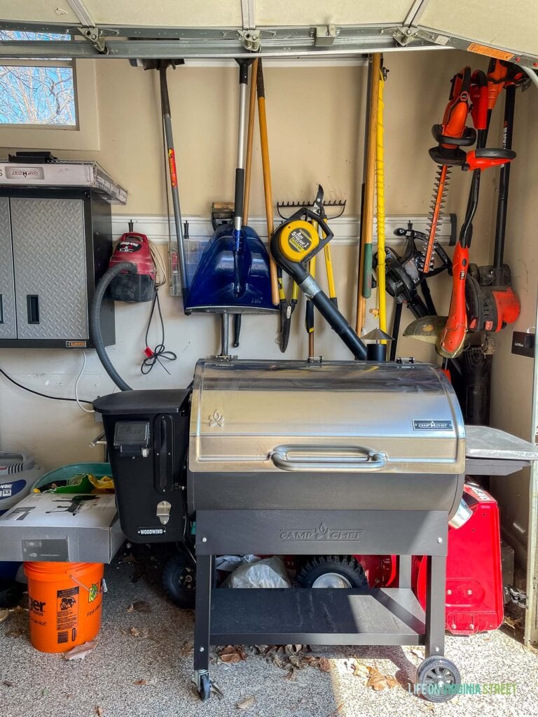 In the pictures above you probably also noticed our new giant slat wall! I love that every single item has it’s own hook now. Previously, we had our yard tools stacked 2-4 deep on one hook and it was always a process to get the item we needed. Kurtis loves using the Hello Garage organization components to get creative and hang things he uses frequently, like our yard tools and rolls of extension cords! It’s nice to have them easily accessible but also out of the way.