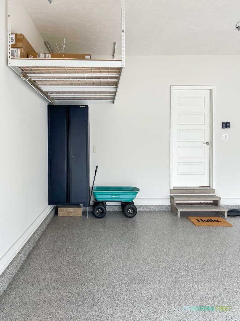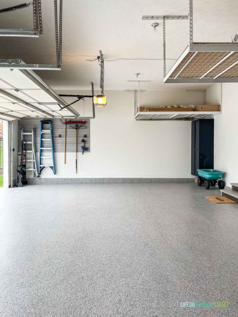 We used the other half of the work bench cabinets on this wall. It’s the perfect spot for Kurtis to store pool supplies and hide a few extra wall caps for our retaining walls out back. I use the wagon almost daily in the summertime for work around the yard – particularly during planting season! So, I like to have it handy this time of year. In the winter months, we can store it on the slat wall or above the cabinets. You’ll noticed we also kept our overhead storage racks to hold the pool furniture in the winter months. They are also super handy to have to help keep our garage organized in the winter months! I’m still admiring just how good our new floors look in this photo too!