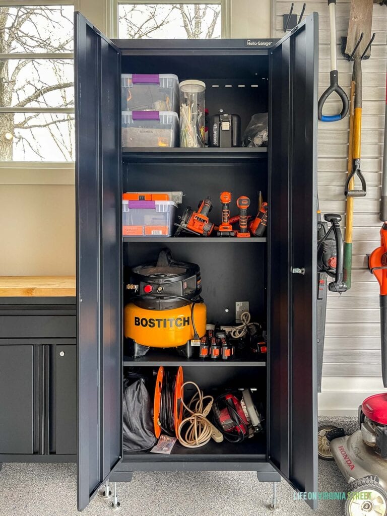 The cabinet to the right side of the work bench holds most of Kurtis’ tools. The team at Hello Garage was able to incorporate our wall outlet into the back of the cabinet. They did an amazing job of integrating it seamlessly in the perfect location. Now we can charge all of our universal 20V batteries for our drills, leaf blower, trimmer, etc. right from the cabinet. It’s so handy and we never have to worry about not having charged tools!