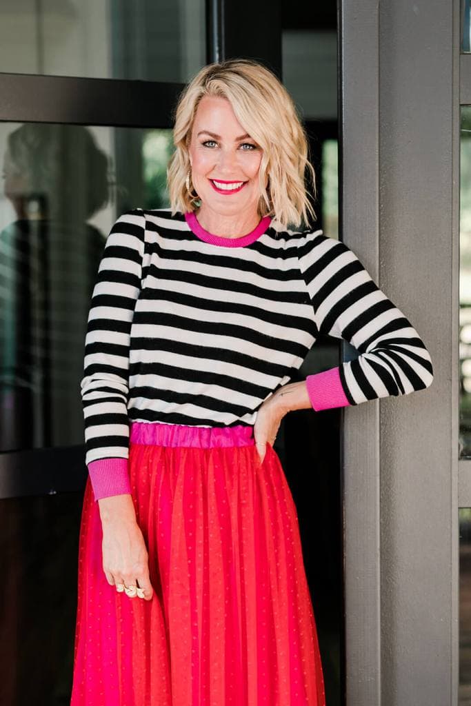 Next up is this darling gathered sleeve crewneck pullover. I ordered the exact combo on Cassie below, but there are so many other cute options including solids and other prints (the pink and red is my next favorite)! I love the slightly gathered shoulder and the material is that soft, cozy fabric Gibson is known for! So cute with jeans or dressed up! Cassie has it paired here with the darling mesh swiss dot party skirt.