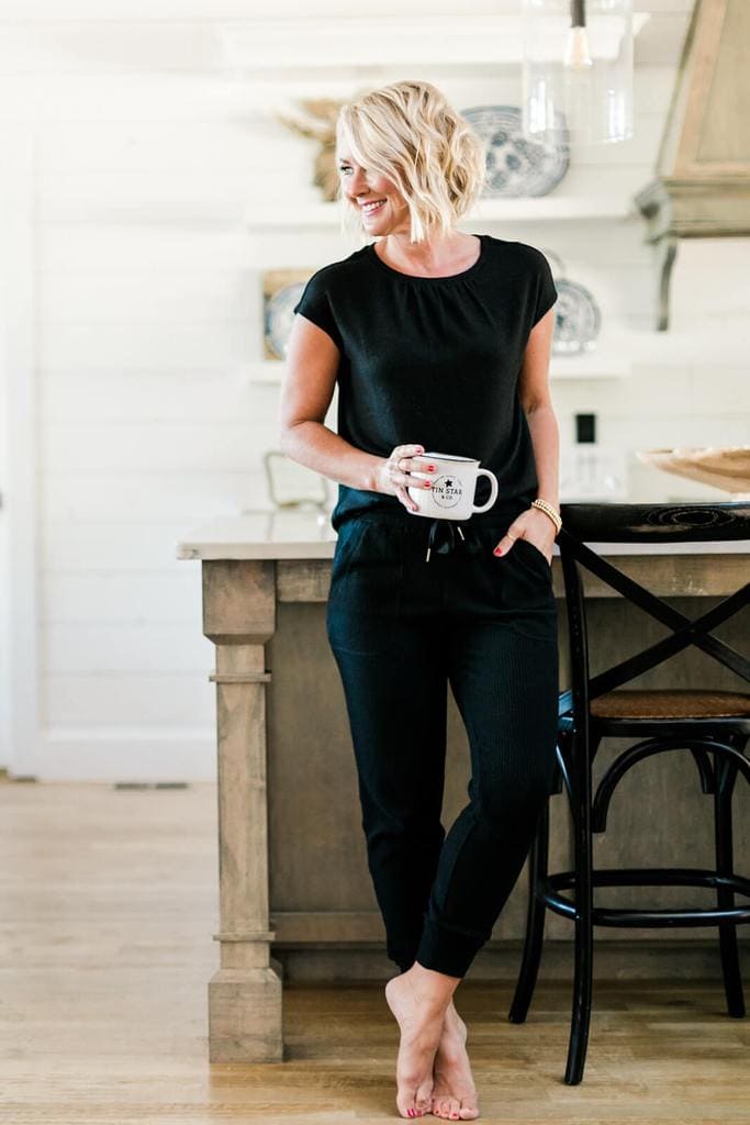 And like I mentioned, the collection even includes items if you plan to stay in and cozy for the holidays! This lounge set is so dang good and I love that it’s ribbed – such a luxe vibe! I have the exact hoodie and jogger combo on Cassie below, but it also comes in black and is designed to mix and match! I actually ordered an XL in the joggers because the samples were out of Large, and I think I’m now going to order in my proper size. I can make the XL work but there’s a lot of extra fabric, and I think it would be a cuter fit in my true size. I also love the joggers paired with this top (I got the black but there are several options). Sometimes it’s nice to have a short sleeve cozy top!